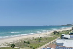 Second bedroom located in studio apartment has a new comfy king bed or on request be 2 long single beds. There is a lockable entry door that accesses both so the doors to each space can be kept open if required. Both bedrooms have: Smart TV, Air con, Ceiling Fans, Block out Blinds and Curtains, Bedside Tables with Lamps, Spacious Wardrobes with quality wooden coat hangers and Beach Views. |